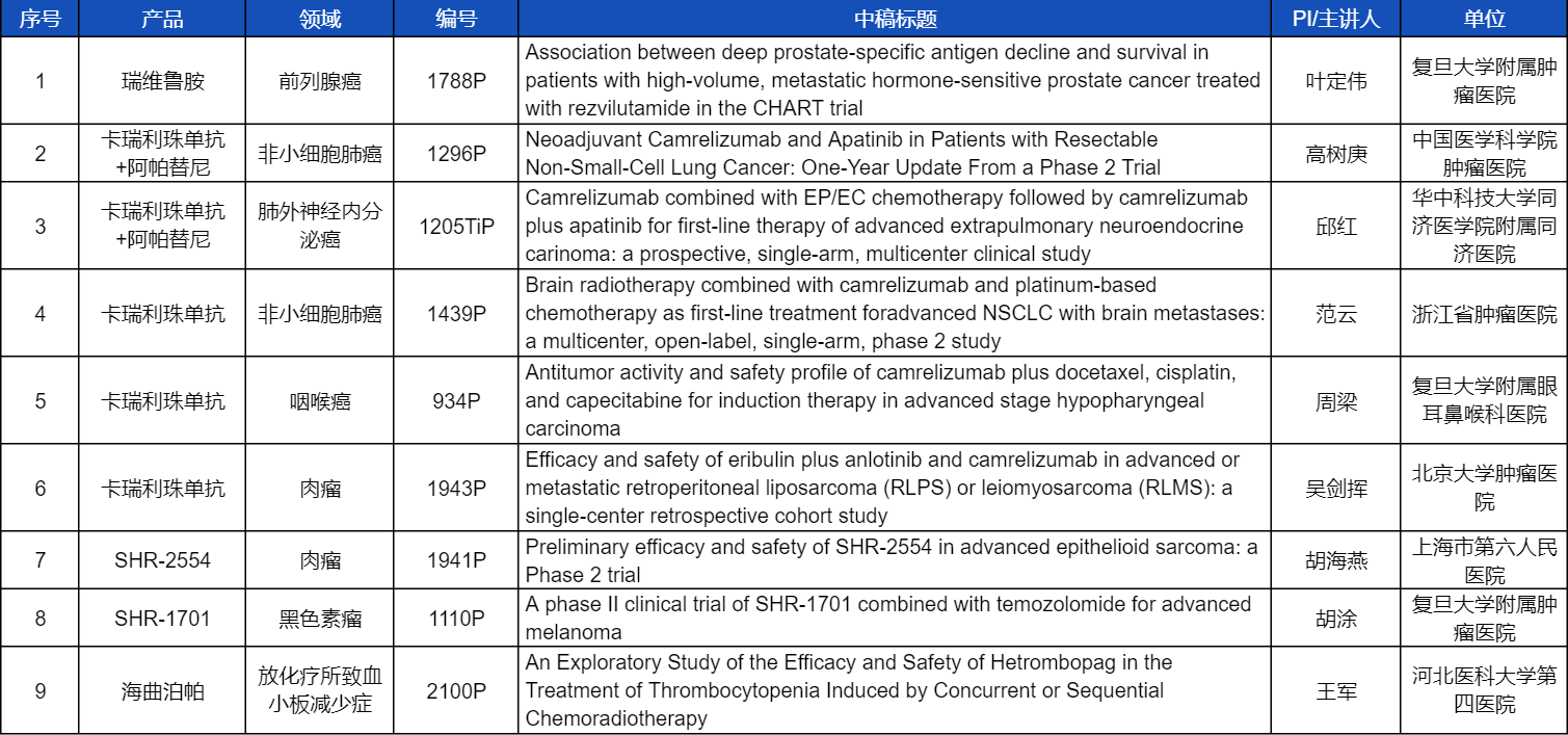 在非小细胞肺癌、咽喉癌、肉瘤、前列腺癌、黑色素瘤等多个领域,卡瑞利珠单抗、阿帕替尼、瑞维鲁胺、SHR-1701、SHR2554等创新产品相关研究一共入选了8项壁报展示。此外,AG亚游集团医药自主研发的血小板生成素受体激动剂(TPO-RA)海曲泊帕在放化疗所致血小板减少领域的探索性研究显示良好的疗效,入选壁报展示。